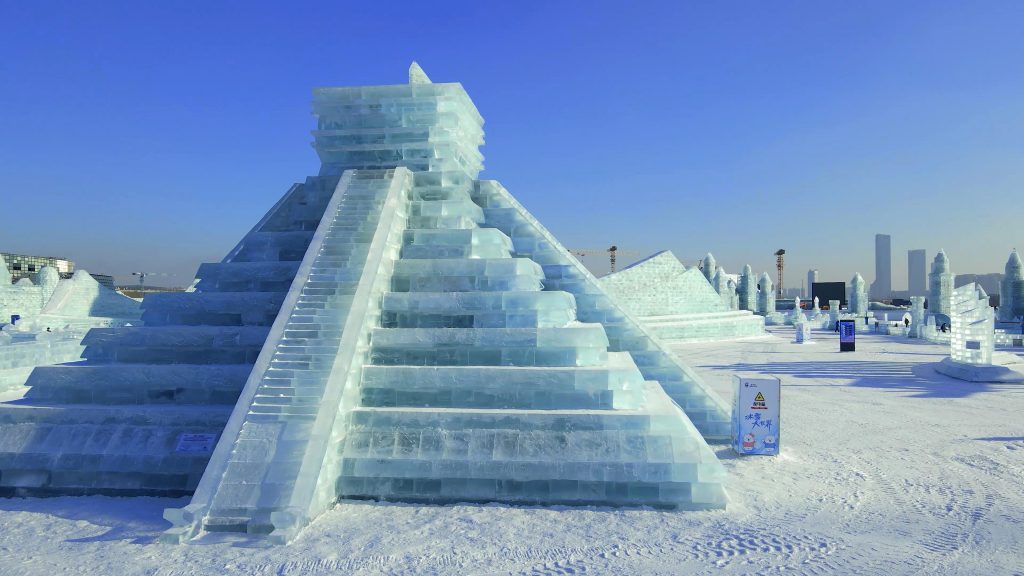 Como inicio de una serie de actividades para celebrar el 50º aniversario de las relaciones diplomáticas entre China y México, la finalización de la escultura de hielo de la Pirámide de Harbin es una mezcla perfecta de la próspera civilización maya y la innovadora cultura china del hielo en Harbin.